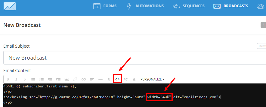 Step 2: To add EmailTimers to the body of your email, click on the “HTML” icon.